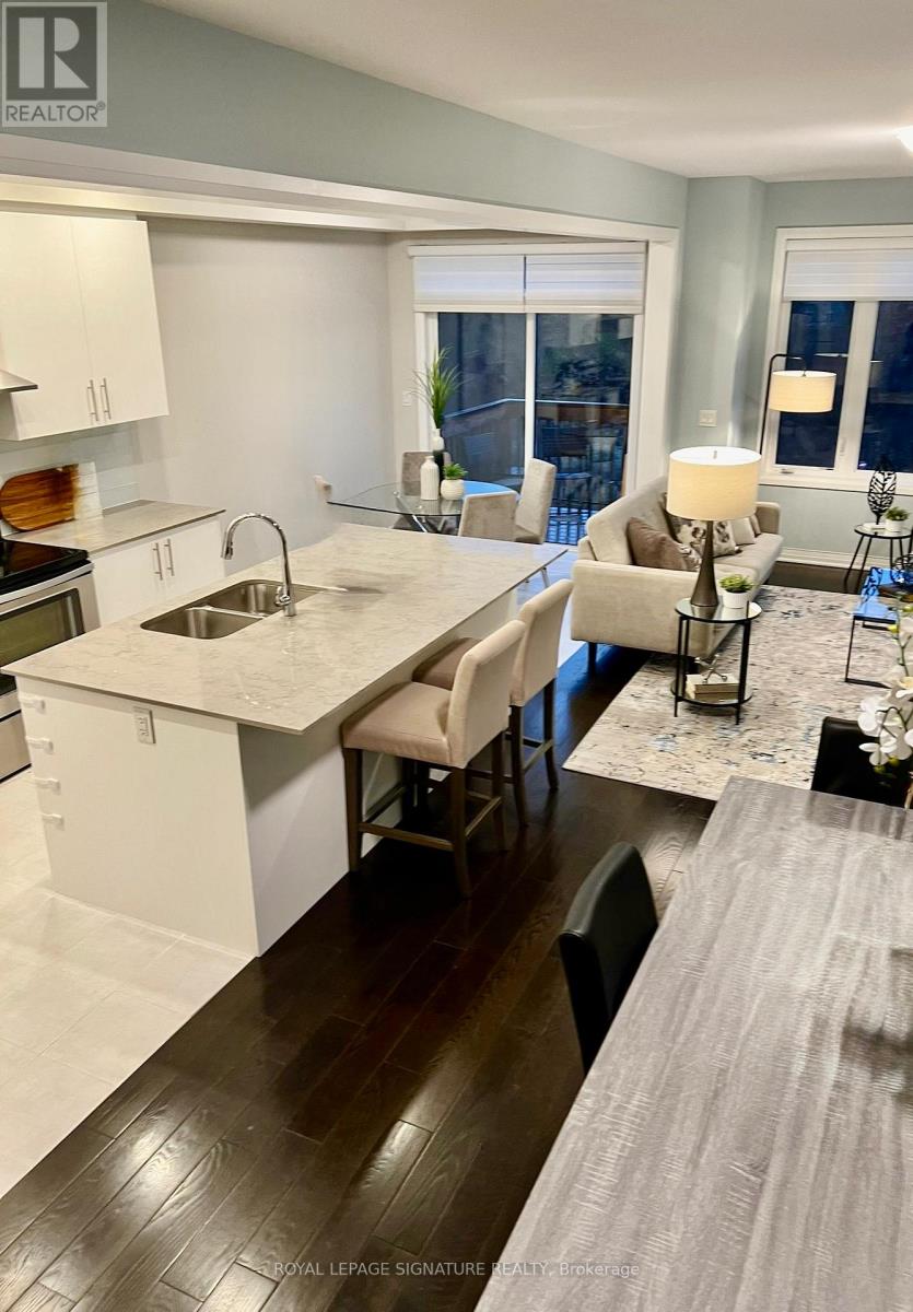 Stunning freehold end-unit townhouse (2018) with 1,778 sq. ft. above grade, attached only by the garage and backing onto serene greenspace. Thoughtfully upgraded with hardwood floors on both levels, smooth ceilings, and 9-ft ceilings on the main floor. Bright, modern eat-in kitchen with quartz countertops, oversized island, and abundant storage. Luxurious primary retreat with a large walk-in closet and 5-piece ensuite. Second bedroom offers a walkout to a private balcony. Direct garage access to the House. Basement has large windows and walkout to the backyard. Great Location, Highways access, Schools, Hospital, Restaurants, Shops, And Walking Trails! (42072064)