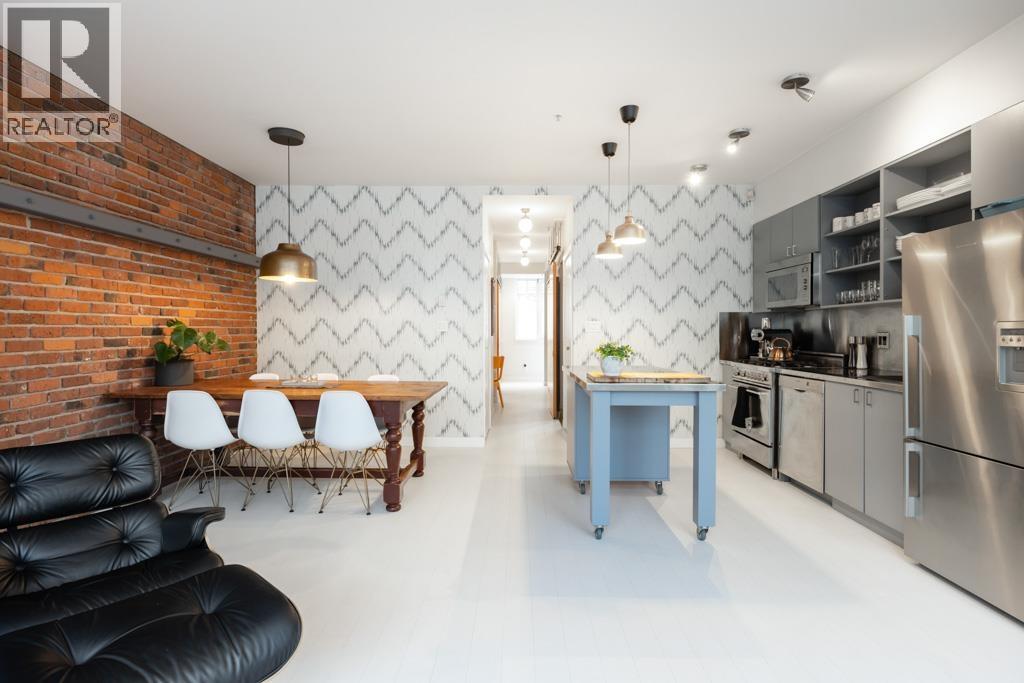 Great creative space in the iconic Crandall Building, a sought-after 1912 loft conversion in Yaletown´s historic warehouse district. Fully furnished and designer-remastered, this unique home features soaring 10-ft ceilings, exposed brick, metal beams, bamboo floors, and a cozy gas fireplace. Two walls of large European turn-and-tilt windows fill the open living, dining, and kitchen areas with natural light. The gourmet kitchen includes high-end stainless steel appliances, Fisher & Paykel fridge, Bertazzoni gas stove, and a mobile butcher-block island. Stylish furnishings, custom millwork, built-in workstation, and surround sound make it perfect for entertaining. Bedrooms feature solid birch barn doors; the primary includes an ensuite with walk-in shower. Includes parking and locker. (32452240)