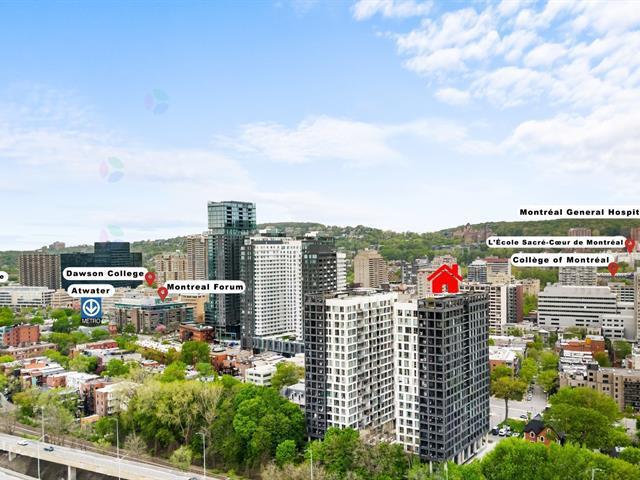 Property Description Short-term rental possible, Beautiful corner unit offering a spacious bedroom, full bathroom, and indoor parking. Open-concept living/dining area with high ceilings and stunning city views. Enjoy 24/7 concierge and great amenities. Prime location steps from Concordia, JMSB, Dawson, LaSalle College, the Montreal General Hospital, restaurants, entertainment, and the metro. (43180071)